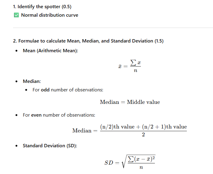 2. Mention the formulae to calculate mean, median, and standard deviation. (1.5)